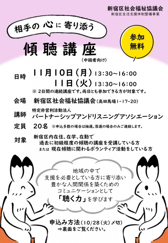今回は中級者向けに開催します。初級程度の傾聴講座の受講経験がある方、いま行っている傾聴活動をより良いものにしたい方、ぜひご参加ください!
