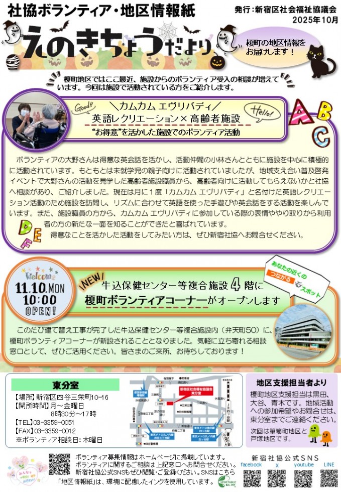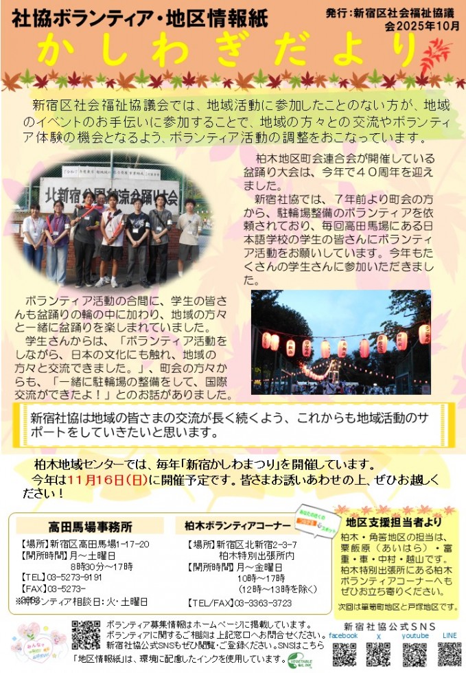 各地区の地域に密着した取り組みや、新宿社協の具体的な活動等をご紹介します。今月は「えのきちょうだより」(榎町地区)「かしわぎだより」(柏木地区)のご案内です。新宿社協HPでは、現在募集中のボランティアや講座情報等を掲載しています。